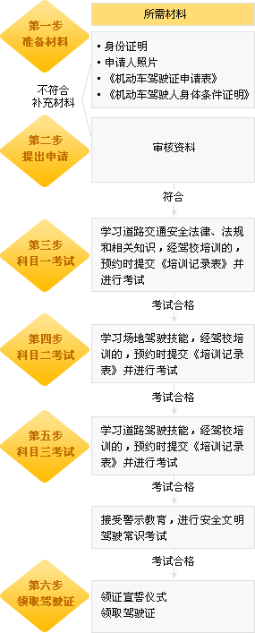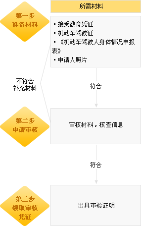 参加学习和教育--材料准备、提交--核查信息(审验内容)--合格的,出具审验证明;不合格的,补齐材料,处理完毕违法、事故等不合格因素。