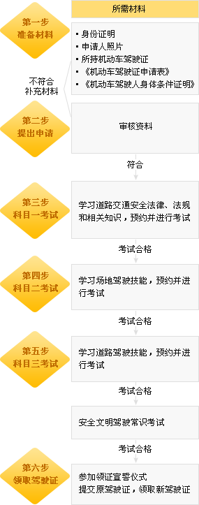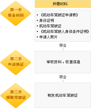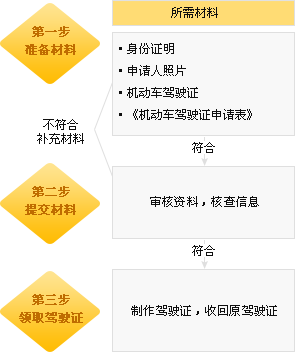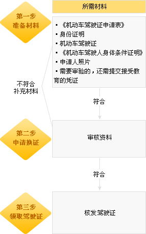 《机动车驾驶证申请表》、身份证明原件和复印件1份、机动车驾驶证、照片2张(用于粘贴申请表和制作新驾驶证)